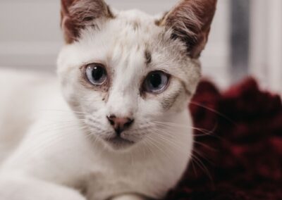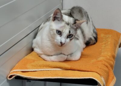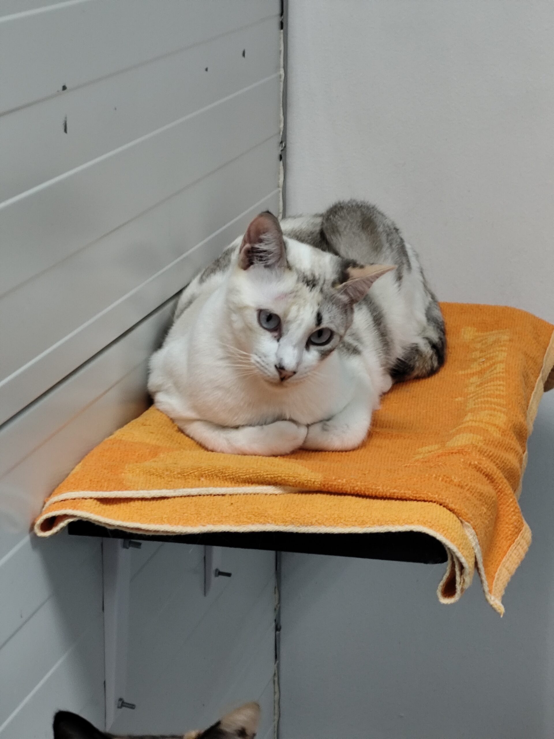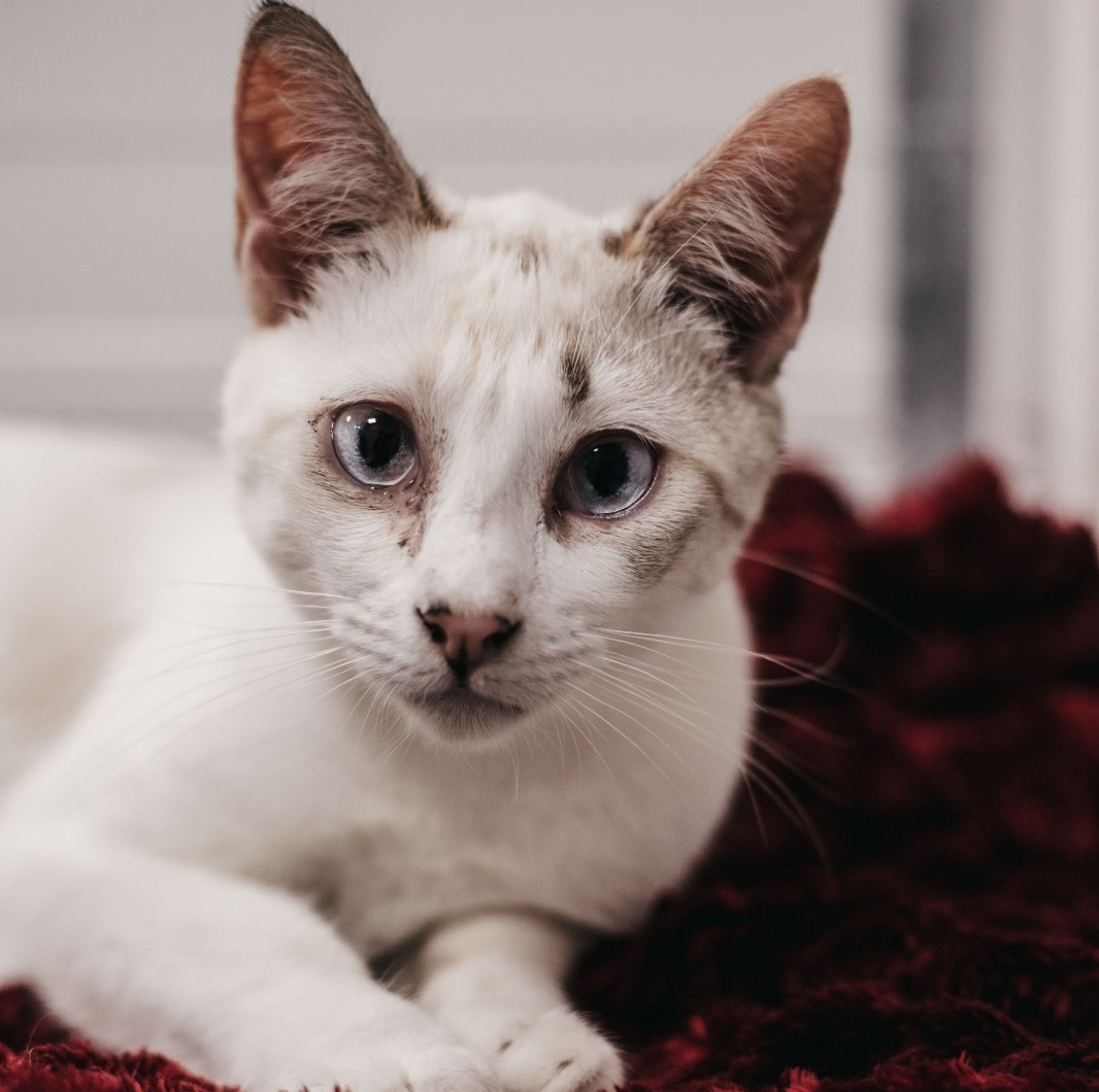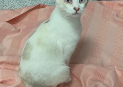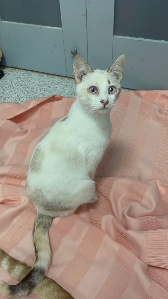 ¡Conoce a Amonet! Esta hermosa gata tiene unos ojos que son un enigma: tal vez sean azules, grises o casi blancos. Amonet llegó a nuestro centro debido a un caso de síndrome de Noé.