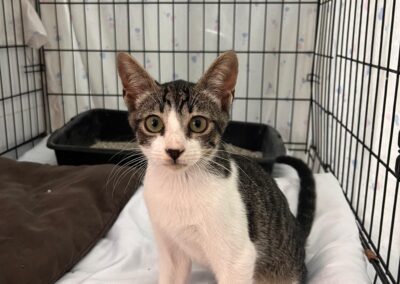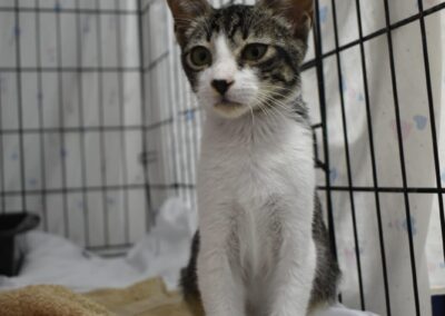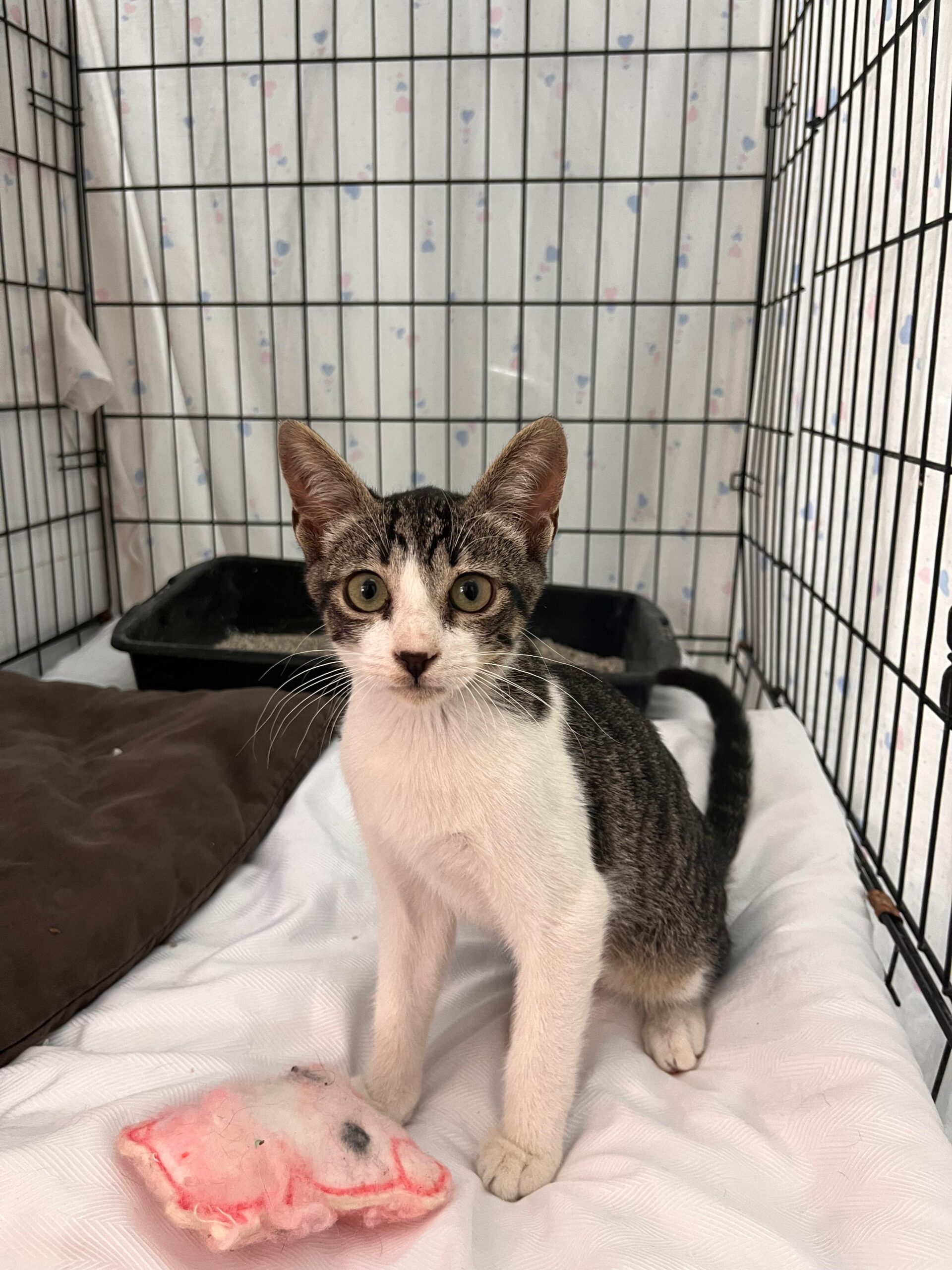 Scofield es un gatito guapetón que apareció entre dos vallas del centro y fue capturado por los trabajadores. Desde entonces, ha mostrado ser un gato muy cariñoso que disfruta de la compañía humana. Le encanta recibir caricias y ronronear mientras le hablan.